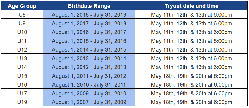 Your player is required to attend their designated age group tryout, even if they are seeking to play in an older division. All requests to play up must receive prior approval from our Director of Coaching, Rudy.